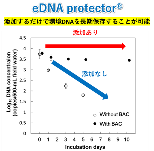 環境DNAは環境中からごく微量なDNAを抽出するため、試料中でのDNA分解を抑制することが重要になります。弊社では龍谷大学および神戸大学との共同研究において、塩化ベンザルコニウム溶液を水試料に添加することで環境DNAの長期保存が可能となることを実証しました (Yamanaka et al., 2017)。環境DNA保存液は、「環境DNA調査・実験マニュアル(環境DNA学会)」にも記載されており、その特許は龍谷大学、神戸大学、日吉が保有しております。弊社に分析依頼を頂いた場合は特許使用許可は不要になります。