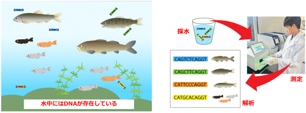 環境DNAとは、水中に残った生物の体液や鱗、糞便由来のDNAのことです。その環境DNAを抽出して解析することにより、その環境における生物の生息状況を推定する手法を環境DNA分析と呼びます。